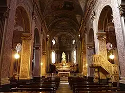 The interior has a three naves separated by square pillars with pilasters which rest on rounded arches. The interior was decorated in the 18th and 19th centuries. The nave has a barrel vault with lunettes, a deep chancel raised and a semicircular apse. The altar (1762) with polychrome marble contains a sculptural group by Francesco Maria Schiaffino depicting the Virgin Mary with cherubs holding up the Holy House of Nazareth.