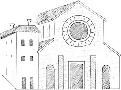 To date there are only two historically reliable and sufficiently clear depictions of the basilica. The first is the miniature on the cover of the Estimo della città di Brescia of 1588, which depicted the eastern side of the Piazza del Duomo, showing the Broletto palace with the Torre del Popolo tower, the Old Cathedral with its campanile (which collapsed in the 18th century), and the basilica itself in an emerging central body with two lower side aisles covered by sloping roofs. A roseate window appears in the upper middle, while below, the entrance portal opens.[5] The building does not quite abut the street (today's Via Querini) but is separated by a set of houses.