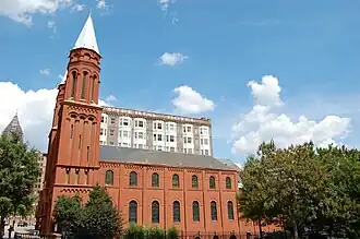 The church is located at 353 Peachtree Street NE,[6] at the intersection of that road and Peachtree Center Avenue (formerly known as Ivy Street[36]).[9][37] The building's design has elements of both the French Romanesque[6][7][16] and Romanesque Revival styles,[15] with architect Robert Michael Craig calling it "one of the finest Romanesque Revival churches in the South".[27] The main building consists of two stories and has a rectangular layout.[15] Its exterior is primarily of brick and terracotta,[7][9] with additional ornamentation in marble.[15] The front of the building consists of an arcade featuring three doorways within rounded arch entryways.[15] Above these entryways is a flat facade with a large rose window that includes a design of the Sacred Heart.[9] While the front entrance initially had five granite steps, these were removed in 1912 after Ivy Street was regraded, making them unnecessary.[16] On either side of the front arcade are two octagonal towers measuring 137 feet (42 m) tall,[7][9] both of which are topped with louvered belfries and pavilion roofs.[15]