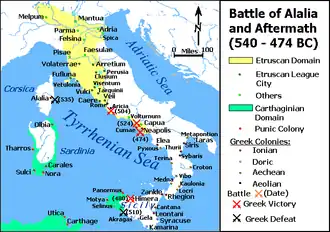 The naval Battle of Alalia took place between 540 BC and 535 BC off the coast of Corsica between Greeks and the allied Etruscans and Carthaginians. A Greek force of 60 Phocaean ships defeated a Punic-Etruscan fleet of 120 ships while emigrating to the western Mediterranean and the nearby colony of Alalia (now Aléria).