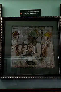 On the north side wall of the memorial shrine, a 16th-century art in traditional style depicting Ajaji on the horse attacking Mirza Aziz Koka on an elephant.