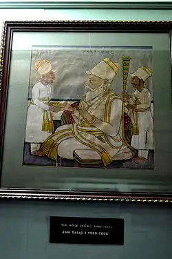 Morbi was granted to Rao Bharmalji as a jagir for his service. Jam Sataji returned Nawanagar in 1593 AD (Vikram Samvat 1649). He lived at Nawanagar but the affairs of the state were managed by the Mughal deputy with his concert. Jasaji, the second son of Jam Sataji, was kept at Delhi for some time.[3][5] In the absence of Sataji, Kalabai; the queen of Kunwar Bhanji, the son of Rana Ramdevji of Ranpur; had conquered the areas formerly lost to Nawanagar with the help of Mers and Rabaris and established its new capital at Chhaya village.[13]