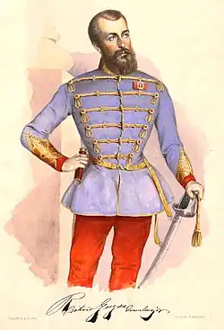Guyon led the column attacking from the front, and, as he did not speak Hungarian well, he addressed the following speech to them, interspersing Hungarian and German words: Vorwärts dupla lénung, rückwärts kartács schiessen.[10] Which in English means something like: “If you go forward, you get double pay, if you retreat, I'll receive you with grapeshots”'.[10] However the attack led by the 33rd Honvéd Battalion was soon repulsed, because the Hungarian cannons, positioned near Korotnok, could not be effectively support the infantry, being on a much lower ground than the attacking soldiers.[8] When the Honvéds retreated, they found themselves confronted by Guyon's cannons, who fulfilled his vow and fired into them,[10] leaving one officer and 10 soldiers dead or wounded.[12] Guyon's center was then contented with a stationary artillery duel until the columns sent against the enemy's right and left and partly in its rear, appeared on the mountaintops surrounding the pass.[8] Then, at about 3 p.m., the 33rd Honvéd Battalion renewed its attack, but this did not go smoothly either.[8]