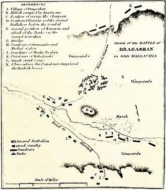 At 19 June 1821, Vasileios Karavias noticed the Ottomans retreating from Drăgășani and commanded his men to attack. The rest of the army, however, was not ready and Karavias acted alone with only 500 horsemen and the "Sacred Band" (a volunteer unit mostly made up of 500 young Greek students from both upper and middle classes led by Nikolaos Ypsilantis and Athanasios Tsakalov).[2]
