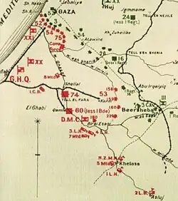 On 24 October the 53rd (Welsh) Division (XX Corps) concentrated between Hisea and Shellal on the Wadi Ghazzeh in the center of the line. The following night the 158th Brigade (53rd Division) crossed the Wadi Ghazzeh, to arrive at El Imara when it extended its right to the Tel el Fara to Beersheba road, covering the railway extension work to Karm.[13]
