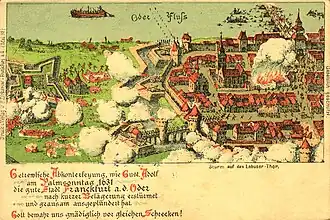 After a two-day siege, Swedish forces, including several regiments of Scottish auxiliaries,[4] stormed the town.[5] Possession of Frankfurt and the subsequent occupation of nearby Landsberg, secured the Swedish army's rear and allowed Gustavus Adolphus of Sweden to advance further into Central Germany.[4]