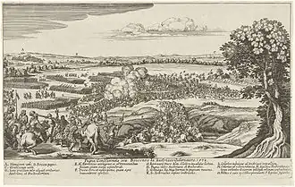 The Netherlandish army tried to regroup, but a cannon and its ammunition blew up, causing many deaths and renewed panic. Meanwhile, part of the rebel troops, mostly Dutch and Scots led by Colonel Henry Balfour, tried to take defensive positions, but could not withstand the musketeers and pikemen led by John, Mondragón, and Gonzaga.[11] The Spanish victory was complete.[21] De Goignies and a large number of his officers were captured,[3] along with thirty-four flags and banners and all the artillery and baggage of the Netherlandish army.[11] 6000 rebel soldiers where killed, with hundreds of prisoners.[3][16] The Spanish casualties, however, were minimal, with a claim of only 12 dead and a few wounded.[13] Around 3,000 rebels reached Gembloux and closed the gates, but after negotiations they surrendered to the Spanish on 5 February, sparing the city from a sack.[6]