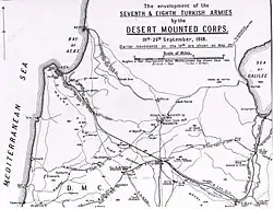 Following the successful advance and virtual encirclement of the Ottoman Seventh and Eighth Armies in the Judean Hills with the captures of Afulah and Nazareth, the Yildirim Army Group general headquarters was out of communication with its three armies.[4][5][6] All direct routes northwards were controlled by the Desert Mounted Corps. Thus, the retreating Seventh Army and what remained of the Eighth Army were forced to withdraw along minor roads or tracks, eastwards across the Jordan River, towards the Hedjaz railway.[7][8] The capture of Haifa was essential for any further advances by the Egyptian Expeditionary Force since the roads leading to the port were little more than tracks and its capture was urgently required for landing supplies.[9][10]