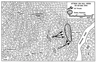 Contact between the two forces was reestablished on 21 December when a Marine patrol was engaged by a force of 14–18 Japanese around Hill 600A.[13] Breaking contact, the patrol returned to US lines where the situation was reported. Subsequently a detachment from the 2nd Battalion, 21st Marines was detailed with returning to the location and putting in an attack that afternoon. The attack went in at 15:45, and for the loss of one man killed and another wounded, they were successful in wresting control of the hill from Japanese, who then retired from the position.[14] As the detachment was too small to hold the position against a Japanese counterattack if one was launched, the Marines returned to their main defensive position before the light failed, and they reported the situation to the 3rd Division command post.[15]