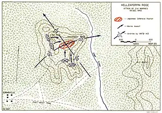 On 5 December the US advance began, and several minor clashes between patrol-sized elements took place.[9] Two days later, Marines from the 3rd Parachute Battalion met resistance along a spur to the west of Eagle Creek, at a position north of the junction of the East–West Trail near Hill 1000, which later became known to US troops as "Hellzapoppin Ridge" (from the musical) because of its difficult terrain,[9] part of a feature the Japanese dubbed "Picha Mountain".[10] Documents captured by the advancing Marines indicated that a reinforced company of 235 men from the Japanese 23rd Infantry Regiment was holding the position.[9] The hill threatened the flank of the 3rd Parachute Battalion's position, and as a result the Marine commander was forced to readjust his dispositions to place the spur to his front. After consolidating their position and sending out patrols, minor skirmishes took place before the Paramarines launched a company-level attack on the morning of 9 December. Although they managed to break-in to the Japanese position, the Marines were forced back by determined Japanese resistance, having sustained heavy casualties.[9] A flanking maneuver also failed to dislodge the defenders. Late in the day, a company from the 1st Battalion, 21st Marines was sent up to reinforce the Paramarines, and the following day the rest of the 21st Marine Regiment, under the command of Colonel Evans O. Ames, arrived to take over responsibility for capturing the spur line around Hill 1000.[9]
