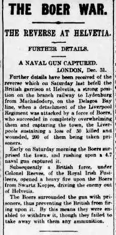 Muller later became particularly famous for the capture of this cannon, jokingly called the 'Lady Roberts'.[6] Major Cotton, 1st Battalion King's Liverpool Regiment, was convicted of quitting his post at Helvetia, but acquitted of neglect of good order and military discipline.[7]