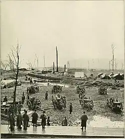 Capt. Morton's guns bombarded the Union supply depot, and the 28 steamboats and barges positioned at the wharf. All three of the Union gunboats—Key West, Tawah, and Elfin—were disabled or destroyed.[8] The Union garrison commander ordered the supply vessels burned to prevent their capture by the Confederates. Forrest observed, "By night the wharf for nearly one mile up and down the river presented one solid sheet of flame. ... Having completed the work designed for the expedition, I moved my command six miles during the night by the light of the enemy's burning property."[9]