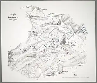 The French and Saxons, who were on the heights southeast of Langensalza, were also separated by the flooded Salza River. Perhaps decisive in the battle was the fact that the French under command of Choiseul-Stainville received orders from their commander-in-chief, Marshal Broglie, to retreat to the Werra River, barely after the engagement had begun. Saint-Pern had already obeyed the same order. Unfortunately, the 3,000 Saxons only received Broglie's order when they were already in the middle of the fight and had to bear its burden alone.[3]