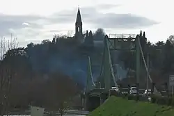 At Gennes, to the west of Saumur, there was no sign of combat troops until the 19th when Wehrmacht scouts arrived in the afternoon and early evening. As motor cyclists approached, the suspension bridge to the north of the island was blown. The 11th century church of St Eusèbe, on the high ground overlooking the bridge was an excellent view point[1]: 104  and a good location for another of the 25 mm guns, however at 8pm on the evening of 19 June, 50 German troop carriers arrived on the north bank packed with assault troops. Artillery began to bombard the island and Gennes, destroying the tower of St Eusèbe and setting buildings in the town on fire.[1]: 106  The Wehrmacht then assaulted the island in the river using rubber boats but were repelled by the Cadets and Algerian riflemen by midnight. An engineer, worried that his charges might be damaged by another bombardment, without orders, blew the southern bridge, isolating the troops on the island. The wounded had to be evacuated by boat.
