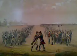 Through a path opened specifically for this operation, Cabañas attacked the enemy at their flank. Colonel José Machain moved to the side to repel them, but was surrounded by Paraguayan cavalry and forced to surrender.[2] Therefore, Belgrano left only a few men in a defensive position and marched to help Machain. Commanding the defenders at the river crossing was major Celestino Vidal, who was left almost blind by cannon fire.