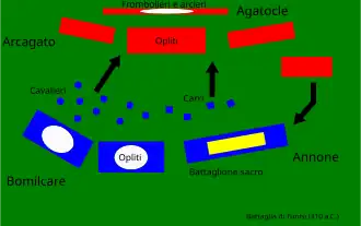 According to Diodorus Siculus, Hanno and Bomilcar wanted to attack Agathocles quickly. So they did not wait for soldiers from the countryside or their allied cities to arrive. They raised an army of 40,000 infantry, 1,000 cavalry and 2,000 chariots from the Carthaginian citizenry.[9] The numbers for the chariots given by Diodorus were probably much exaggerated.[10] Justin writes that the Carthaginian army numbered 30,000 men and mentions only Hanno as the general.[11] The Carthaginians approached Agathocles at his camp near White Tunis and assumed battle formations. Hanno commanded the right flank with the Sacred Band beside him. Bomilcar was on the left flank with a deep phalanx, because the terrain prevented him from extending his formation. They placed the chariots and cavalry in front, who were to strike the Greeks first.[9]