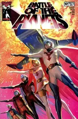 While Battle of the Planets was largely dormant in North America after ending in 1981, the show developed a cult following. In 2001 a boom in 1980s nostalgia in the comics industry followed the successful revivals of G.I. Joe by Devil's Due Publishing and Transformers by Dreamwave Productions, with independent comics publishers scrambling to license similar properties.[5] Top Cow Productions acquired the rights to make new Battle of the Planets comics, and were able to engage painter Alex Ross - a fan of the series growing up, and one of the most popular artists working in comics at the time following Earth X - as the series' art director.[6] To build anticipation, a sketchbook of Ross' redesigns was printed in the pages of Wizard Magazine.[7] Ross contributed designs and cover artwork; the series itself was written by Munier Sharrieff and featured art from Wilson Tortosa. Due to growing knowledge of the show's origins as Gatchaman and the desire to find a more adult audience for the book saw several of the elements added by Sandy Frank, such as the robot 7-Zark-7, omitted.[6]