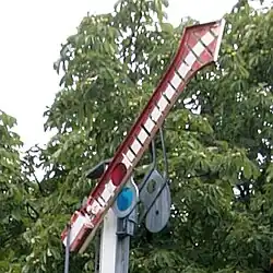 The 'rest signal' (Ruhesignal) on a Bavarian home signal was signalled using an additional aspect: 'rest' (Ruhe). It was used in Bavaria from 1893 to 1975. It was the last signal from the state railway era that was retained in the signalling book of the Deutsche Bundesbahn. This was a single or twin-armed semaphore signal, which took over the function of an exist signal and enhanced it with an additional signal aspect: 'rest' (Ruhe, HpRu). The term 'rest' meant that the railway vehicles were to remain on the allocated track, although shunting was permitted. If the arm was moved to its default position (Halt) the associated track was to be immediately cleared. The aspect, 'rest', was indicated by a downward-pointing semaphore arm or, at night, by a blue light. The Deutsche Reichsbahn marked the signal with an additional board with the letters Ru on it, in order to distinguish it from a normal home signal. The semaphore arm of the rest signal had the same dimensions as those of the Bavarian home signals.