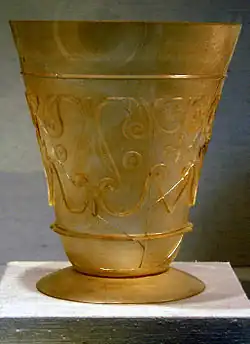 9-10th century beaker from Iran. Blown and relief-cut glass. New York Metropolitan Museum of Art.