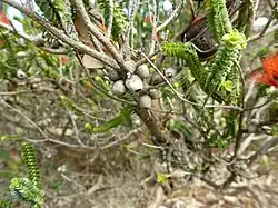 The flowers are usually bright red but sometimes orange or yellow and are arranged in roughly spherical heads on the ends of branches which continue to grow after flowering. The flowers have 5 sepals, 5 petals and 5 bundles of stamens. The stamen bundles, which give the flower its colour, contain 3 to 7 stamens and are joined for more than half their length. Flowering occurs from July to December or from January to May and is followed by fruits which are woody capsules.[2][4][5]