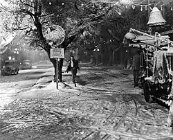 The film was shot at RKO Radio Pictures Studio in Culver City, California, and the 89 acre RKO movie ranch in Encino,[15] where "Bedford Falls" consisted of Art Director Max Ree's Oscar-winning sets originally designed for the 1931 epic film Cimarron that covered four acres (1.6 ha), assembled from three separate parts, with a main street stretching 300 yards (three city blocks), with 75 stores and buildings, and a residential neighborhood.[16] Capra built a working bank set, added a tree-lined center parkway, and planted 20 full grown oak trees to existing sets for It's a Wonderful Life.[17]
