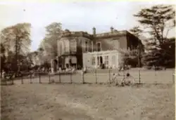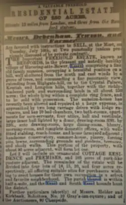 John Heaton rebuilt the house at Bedfords as a two-storey brick mansion rendered with cement, and resided there until his death in 1818. Upper Bedfords (previously Earls) was also rebuilt during this time in a crenelated style, including a tower which has often caused it to be mistaken for a church.[8] It was at this time (c. 1777) that the lane which had run from Broxhill Road to Lower Bedfords Road and going past Bedfords was closed by the owner.[9] This is also the point at which today's park is recognisable as Chapman and Andre's survey of that time depicts the northern tree line, approach avenue, and park boundaries as they occur today.[12] The property passed down two generations in the Heaton family, although it was let to tenants between 1826 and 1834. At this point the property again changed hands several times and was even listed in the Chelmsford Chronicle on 21 June 1867 (on page 4):