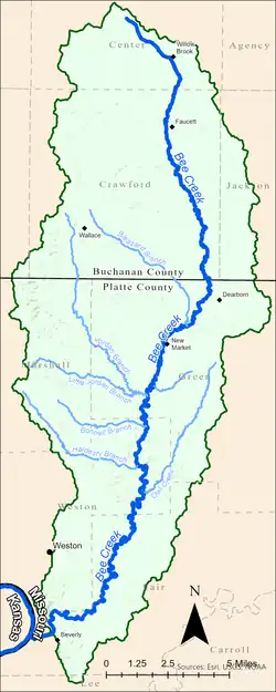 Bee Creek is a left tributary of the Missouri River and joins it about 34 miles upstream from Kaw Point in Kansas City, and 401 miles before its mouth in the Mississippi River.[5] The land surrounding Bee Creek is a mix of woodlands and croplands. There is one state park and two conservation areas in the Bee Creek watershed: Weston Bend State Park, Bee Creek Conservation Area, and Guy B Park Conservation Area. Also, Bee Creek comprises the southeastern boundary of Weston Bend State Park.[6] There are a three notable water bodies in the watershed: Beverly Lake, Dearborn Reservoir, and Trickey Lake.