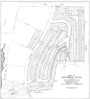 Beechmont, a high, woodland tract of several hundred acres, was planned by Eugene and John Lambden in 1902 for the City Realty Company. City Realty was a company formed by the Lambden family, local lawyers and bankers who purchased portions of the Pugsley and Montgomery farms for the creation of a residential community. By damming Pine Brook, the Company created the centerpiece of their development, Beechmont Lake.[4] Met with an unusual public favor from the start, the area was commonly referred to as 'New Rochelle's Tuxedo'.
