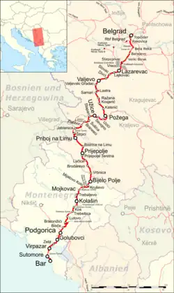 The Belgrade–Bar railway (Serbian: Пруга Београд–Бар, Pruga Beograd–Bar) is a 476.59 km (296.14 mi) long electrified main line connecting the Serbian capital of Belgrade with the town of Bar, a major seaport in Montenegro. Completed in 1976, which connects Belgrade with the Mediterranean port of Bar. It was built by the Yugoslav State Railways (JŽ) in 25 years of construction[1] and is now operated by its successor companies Železnice Srbije (ŽS), Željeznice Republike Srpske (ŽRS) and Željeznička Infrastruktura Crne Gore (ŽICG).