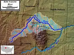 The Belle Fourche River (pronounced bel FOOSH; Lakota: Šahíyela Wakpá[1]) is a tributary of the Cheyenne River, approximately 290 miles (470 km) long, in the U.S. states of Wyoming and South Dakota.[2] It is part of the Mississippi River watershed via the Cheyenne and Missouri rivers. In the latter part of the 19th century, the Belle Fourche River was known as the North Fork of the Cheyenne River.[3] Belle Fourche is a name derived from French meaning "beautiful fork".[4]