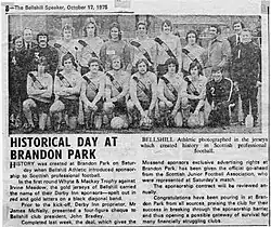 In 1975, Andrew Goodwin secured a four figure deal with The Derby Inn (a pub in Mossend), making Bellshill Athletic the first football club in Britain to wear sponsors on their shirts.[1]