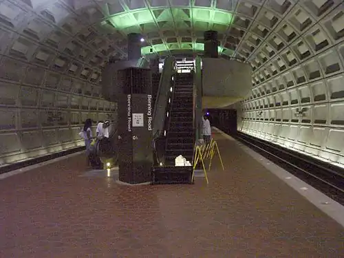Benning Road station is an island-platformed Washington Metro station in the Benning Ridge neighborhood of Northeast Washington, D.C., United States. The station was opened on November 22, 1980, and is operated by the Washington Metropolitan Area Transit Authority (WMATA). Providing service for the Blue and Silver Lines, the station is located in a residential area near the intersection of Benning Road and East Capitol Street. It is the first station after the Blue and Silver Lines diverge from the Orange Line east of the Anacostia River, and also the last station in the District of Columbia going east.