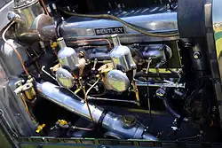 The engine was "resolutely modern"[10] for the time. The displacement was 4,398 cc (268.4 cu in): 100 mm (3.9 in) bore and 140 mm (5.5 in) stroke. Two SU carburetters and dual ignition with Bosch magnetos were fitted. The engine produced 110 hp (82 kW) for the touring model and 130 hp (97 kW) for the racing model. The engine speed was limited to 4,000 rpm.[10][18] A single, crossflow, overhead camshaft actuated four valves per cylinder, inclined at 30 degrees. This was a technically advanced design at a time where most cars used only two valves per cylinder in a side-valve cylinder head.[18][19] The camshaft was driven by bevel gears on a vertical shaft at the front of the engine, as on the 3 Litre engine.[20]