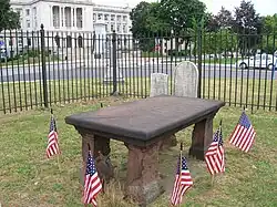 The Green is a public square located across the street from the courthouse at the corner of Main Street and Court Street. On the west side of the green is a marker showing where the second courthouse stood before it was burned by the British in 1780. A bronze statue is located at the intersection of Court Street and Washington Place. This statue is of General Enoch Poor. General Poor, a New Hampshire native, was a hero at the Battle of Saratoga in 1777. General Poor served under General Washington. He was in New Jersey organizing an army to raid New York City. General Poor died in 1780 and is buried across the street from the Green at the Dutch Reformed Church. General Washington and the Marquis de Lafayette attended General Poor's funeral.