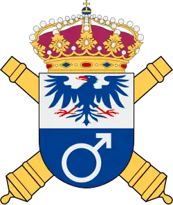 The coat of the arms of the Bergslagen Artillery Regiment (A 9) 1977–2000. Blazon: "Per pale argent and azure; argent an eagle wings elevated and displayed azure, armed and langued gules, azure an iron sign argent. The shield surmoun-ted two gunbarrels of older pattern in saltire or. The gunbarrels may be sable".[5]