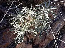 A perennial herb or subshrub up to c. 1.5 m. tall. Stems branched, whitish araneose-tomentose, or glabrescent, leafy. Leaves sessile, 3–6 cm. long, dentate to pinnatifid-dentate; lamina (excluding the teeth or lobes) 2–3(4) mm. wide and linear or 5–15 mm. wide and lanceolate; teeth 3–8 on each side, each tooth 2–6(10) mm. long, triangular or linear and extended in a tawny spine 2–3 mm. long; margins of teeth and sinuses entire or armed with smaller spines; upper surface smooth or somewhat scabrous, slightly to densely araneose-tomentose or glabrescent; lower surface whitish felted-tomentose. Capitula radiate, solitary and terminal on the branches, or subcorymbosely arranged, 2.5–5(+?) cm. in diam. including the rays. Phyllaries spreading, felted-tomentose outside, subglabrous or glabrous inside, 10–20 x 1–3 mm., linear-lanceolate, spiny-acuminate, ciliate-spinescent on the margins with spines 1–3 mm. long; the outermost phyllaries ± leaf-like with small spine-tipped teeth; inner phyllaries smaller and less spinescent-ciliate. Margins of the receptacular alveoli extended into straw-coloured bristles 1–2 mm. long. Achenes 1.5–3.5 mm. long, turbinate, 8–10-ribbed, strigose-sericeous, glandular-viscid at the apex. Pappus scales 2-seriate, 1–1.5 mm. long, narrowly oblong, acute or subobtuse, denticulate towards the apex.