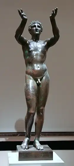 The Praying Boy (in German, Der betende Knabe), also known as the Berlin Adorant, is an Ancient Greek bronze statue of a naked male youth with arms raised, which stands 128 cm (50 in) high, at or perhaps slightly smaller than life size. Sculpted in a Hellenistic style, it is dated to c.300BC, and attributed to the school of Lysippos. It is held by the Altes Museum in Berlin.