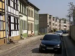 Until the 1960s, the city centre, enclosed by the defensive wall, consisted of small old buildings with timber framed construction. Most of them were disrepair because no funds were available in East Germany to renovate them. It was decided to change Bernau into an exemplary city of socialist architecture. Nearly all the old houses were torn down in the 1960s and 1970s and new Plattenbauten (buildings constructed of prefabricated concrete slabs) were built. The new houses had a maximum of four storeys to fit in with the historical architecture of the city.