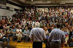 On a three-day West Coast tour in August, Black Lives Matter activists interrupted an event in Seattle. The activists removed Sanders from the podium and Sanders looked on as they spoke. The campaign eventually shut down the event.[76] On the following day Sanders spoke to a crowd of 28,000 supporters at the Moda Center in Portland, Oregon,[77] and on August 10 more than 27,000 people showed up for his rally in the Los Angeles Memorial Sports Arena. On September 14, 2015, Sanders spoke at Liberty University, a highly Republican-influenced college, during their Convocation.[78]