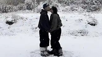 A screenshot from the music video, depicting Rosalía and Alejandro kissing each other in the snow.