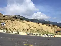 Graffiti on a road on the border between Dâmbovița County and Prahova County, in Romania, saying Uniți sub tricolor – Basarabia e România! ("United under the tricolor – Bessarabia is Romania!").