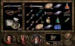 The inventory management allows transferring items between the party characters. In the case of stacks of multiple items, there's also an option to distribute them evenly within the party. The game also manages money and keys independently.