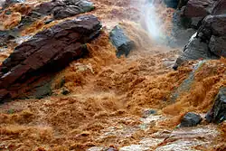Betsiboka River is a 525-kilometre (326 mi) long river in central-north Madagascar. It flows northwestward and empties to Bombetoka Bay, forming a large delta. It originates to the east of Antananarivo. The river is surrounded in mangroves.[3] The river is distinctive for its red-coloured water, which is caused by river sediments. The river carries an enormous amount of reddish-orange silt to the sea. Much of this silt is deposited at the mouth of the river or in the bay.