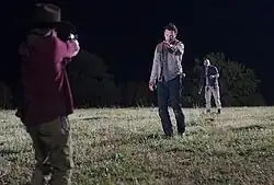 "Better Angels" was directed by Guy Ferland and written by Evan Reilly and showrunner Glen Mazzara. The episode features the death of Shane Walsh, who was stabbed in the chest by Rick Grimes. Subsequently, Shane reanimates into a zombie and is later shot in the head by Carl Grimes. Initial talks of killing off the character commenced before the auditioning process of the series. Because of the short length of the first season of The Walking Dead, producers decided to retain the idea until the following season.[2] Writer Robert Kirkman remarked: "We knew from Day 1 when we sat down in the writers' room to pull out the second season that this was going to be the season that Shane died. It was always about working toward that and building up that character and setting up this confrontation between Rick and Shane."[2] Jon Bernthal admitted that he had no coaching prior to the scene, and said that many of the writers and cast members were divided on how to execute the sequence.[3] "There was a lot of discussion going back and forth, a lot of arguing going back and forth on what that last scene actually should be — between myself and Andy and the writers. And everybody kind of got their own little say in what that last scene actually was."[3] In his interview with Entertainment Weekly, Bernthal recalled the production of the scene: