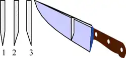 Kitchen knives: (1) symmetrical, (2) right-handed, (3) left-handed. Cross sections seen from the handle.
