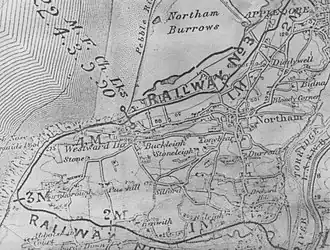 The railway was built in three sections, with the first being from Bideford at 1 furlong, 9 chains and 50 links (0.39 km), the second from the termination of the first, being to Westward Ho!, length 4 miles (6.4 km), 3 furlongs, 9 chains and 50 links (7.23 km), and the third being from the termination of the second, to Appledore, length 2 miles (3.2 km), 3 furlongs and 4.2 chains (3.91 km).[7] The contract for construction was awarded to Charles Shadwell of Blackburn and the estimate was for £50,000. The initial outlay was £87,208, but Shadwell was removed from his post on 13 December 1901. A subsequent court action proved that he did 'wilfully default' and judgment was given against him in 1905 for £7,500. Plans had been made for a 3 ft (0.91 m) gauge track, however as it was hoped to connect the line with the L&SWR by a bridge over the Torridge, the line was built to standard gauge. Gradients were severe in places, with a 1 in 47 (112 ft/mi) on the Kenwith Castle to Abbotsham Road section.