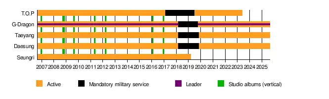 On May 31, 2023, T.O.P revealed that he had "already withdrawn" from the group.[3] In January 2025, T.O.P. ruled out a return to the group and stated that his departure was due to his scandal and feeling ashamed of facing the other members.[200][201] In June 2023, G-Dragon's official contract with YG expired, making him the last member of Bigbang to leave the label.[202][203] In January 2024, the group's artist profile was removed from YG, signifying that the group is no longer under the label.[204][205]