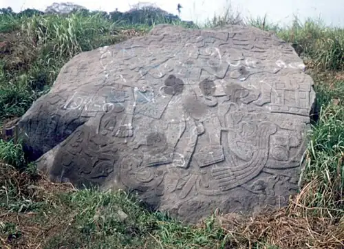 Monument 21 is a basalt boulder in a sugarcane field. The boulder has an artificially flattened upper surface bearing a bas-relief sculpture. The carved face has a 35° slope and measures 11 by 13 feet (3.4 by 4.0 m). The sculpture depicts three main figures. The central figure is the largest and faces towards a second figure seated on a throne. The third figure is behind the central figure, it is smaller and holds a hand puppet. The scene is filled out with twisting vines that sprout cocoa pods bearing human faces. Other details of the monument include birds, snakes and a butterfly with a human head. Monument 21 has been dated to the Classic period.[5] Monument 21 is located east of Mound 2, in the centre of Group B.[35] The decoration on the skirt of one of the figures may be the face of the central Mexican deity Xipe Totec.[13]