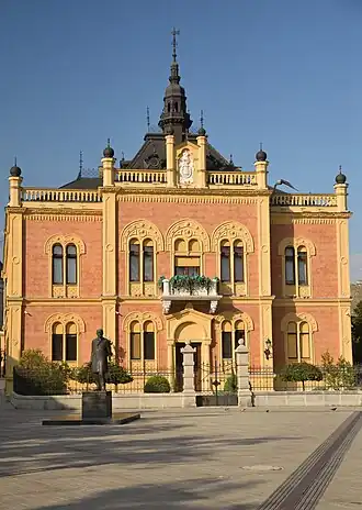 The palace was completed in 1901 and has since served as the residence of the Bishop of Bačka.[2] Its facade, featuring bifora windows inspired by medieval Serbian monasteries. After the unification of Banat, Bačka and Baranja with Kingdom of Serbia in the process of creation of Yugoslavia, during a visit to Novi Sad in 1919, Prince Regent Aleksandar Karađorđević addressed the people from the balcony of the Bishop's Palace.[2] In front of the palace stands a monument to poet Jovan Jovanović Zmaj, erected in 1984, marking the location of annual celebrations for the Zmaj Children's Games.