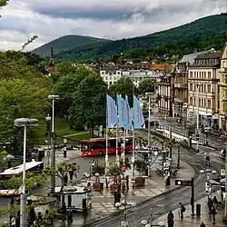 The Bismarckplatz (ⓘ) in Heidelberg is a square named for Otto von Bismarck, located at the western end of the Hauptstrasse, which forms the boundary between the old city and the suburb of Bergheim. It is one of the main squares of Heidelberg and one of the central nodes of the public transport system, along with Willy-Brandt-Platz in front of the train station.
